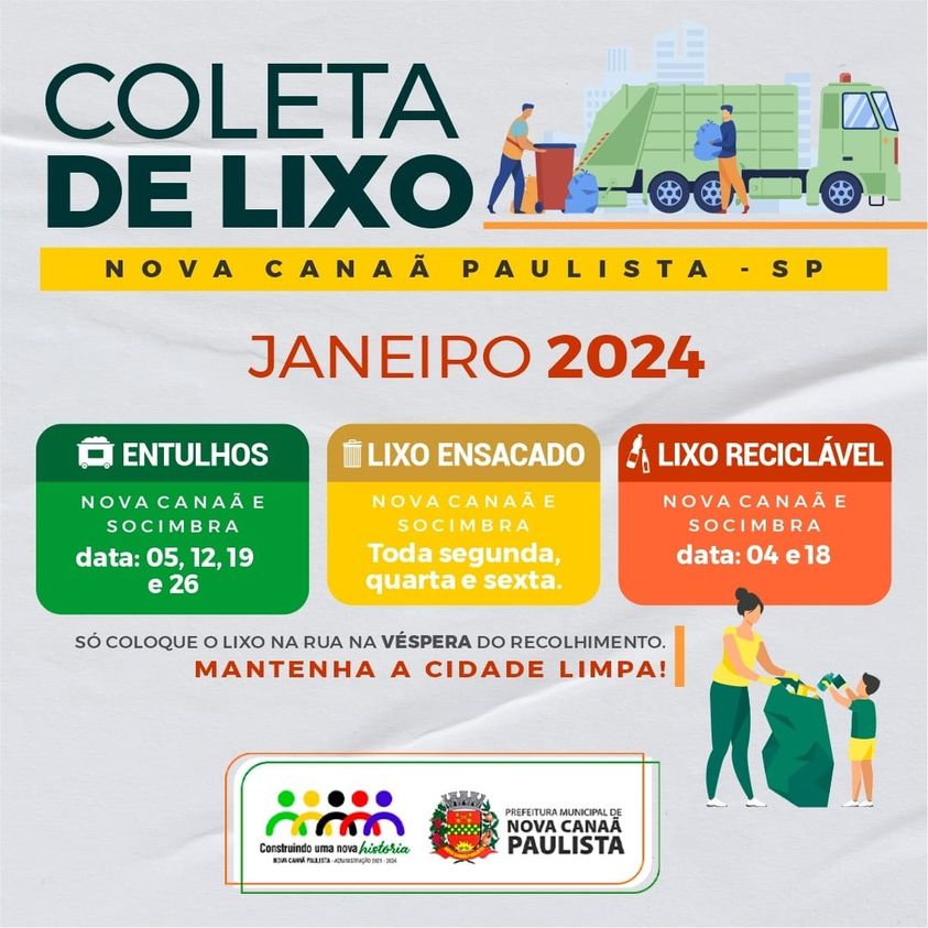CotidianoNova Canaã PaulistaSaúde Atenção população de Nova Canaã Paulista e Socimbra! Coleta de Lixo Janeiro 2024 Janeiro 8, 2024 admin