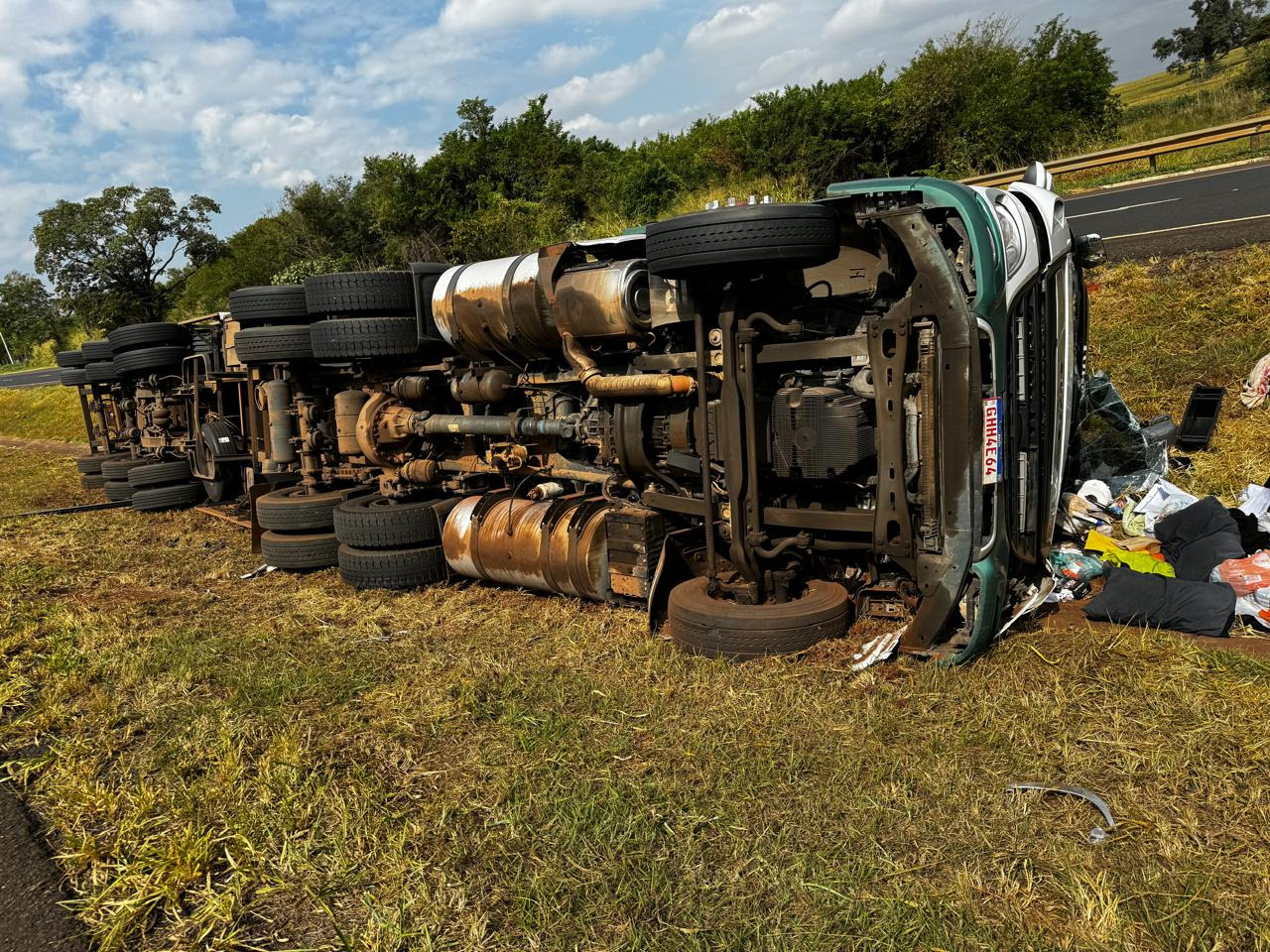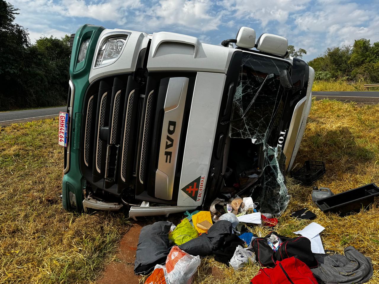 Infelizmente, a colisão fez com que o condutor do caminhão perdesse o controle do veículo, culminando no tombamento do mesmo no canteiro central.